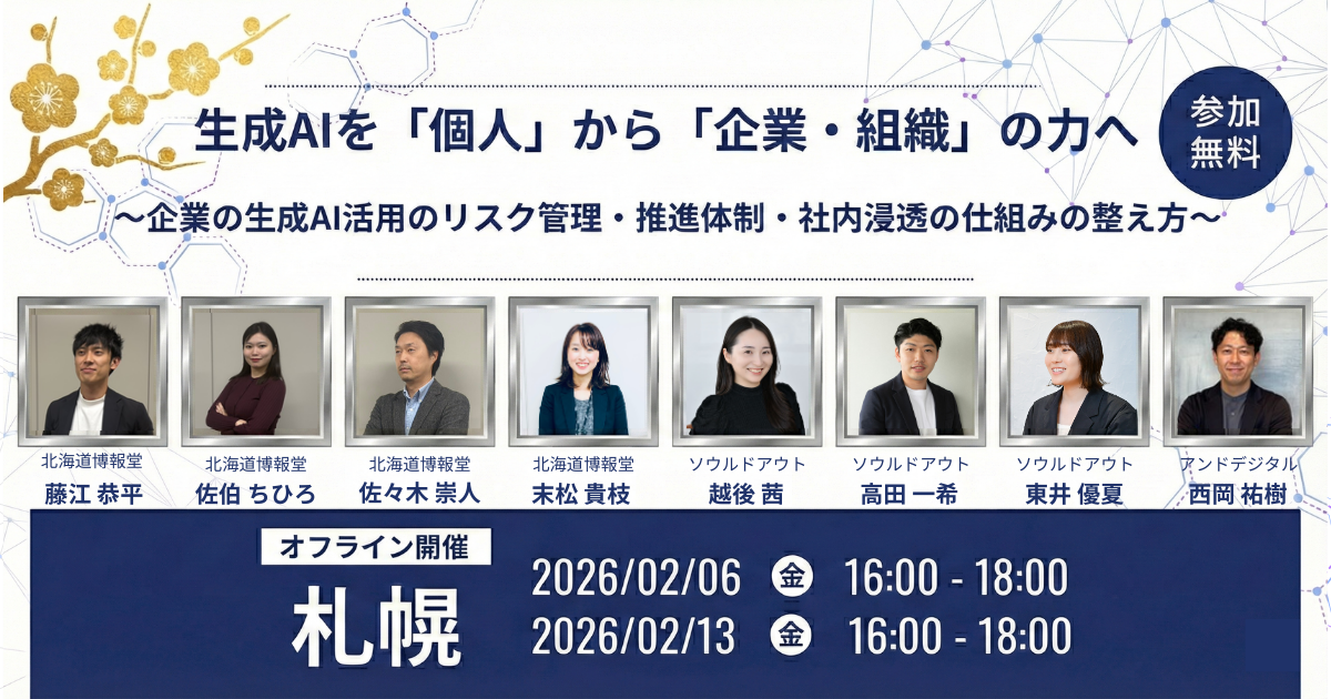 ソウルドアウトグループが、生成AIを“個人の道具”で終わらせず“企業・組織の力”に変えていくための、社内浸透・リスク管理・推進体制づくりのポイントを解説します。