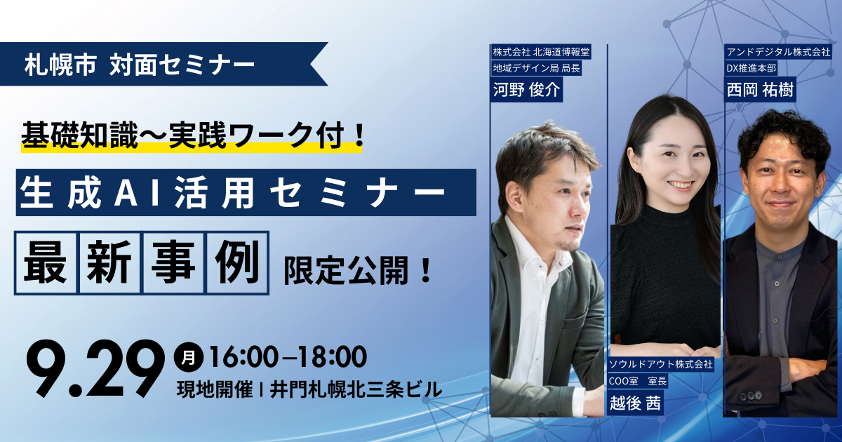 生成AIの基礎知識から、地域企業・ソウルドアウト社の最新事例の紹介、そしてワークショップまで。明日から業務にすぐ使える活用法を学べる実践型セミナーです。AIをどう業務に取り入れるか悩んでいる方に最適です。