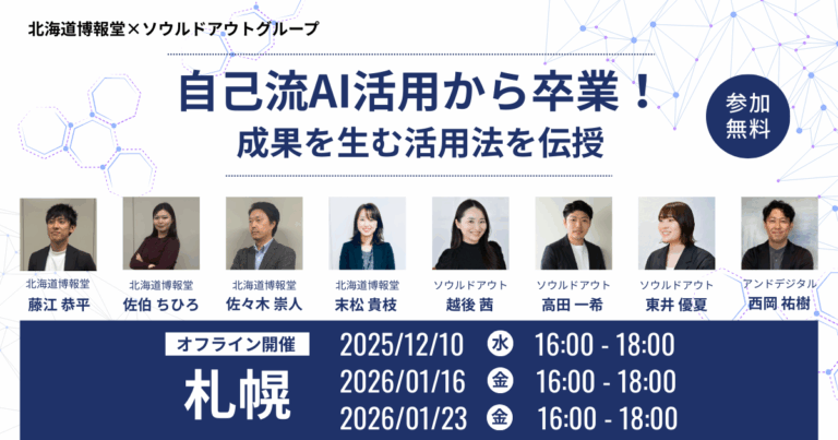 2026年01月23日(金)16時~18時 (開場:15時30分)セミナー概要 無料AIを“自己流”で使っているけれど、成果に結びつかない——そんなお悩みを札幌・帯広で解消!本セミナーでは、北海道博報堂×ソウルドアウトグループが、情報漏えいなどのリスクを避けつつ、営業・採用・事務などの...登壇者株式会社北海道博報堂 佐々木 崇人